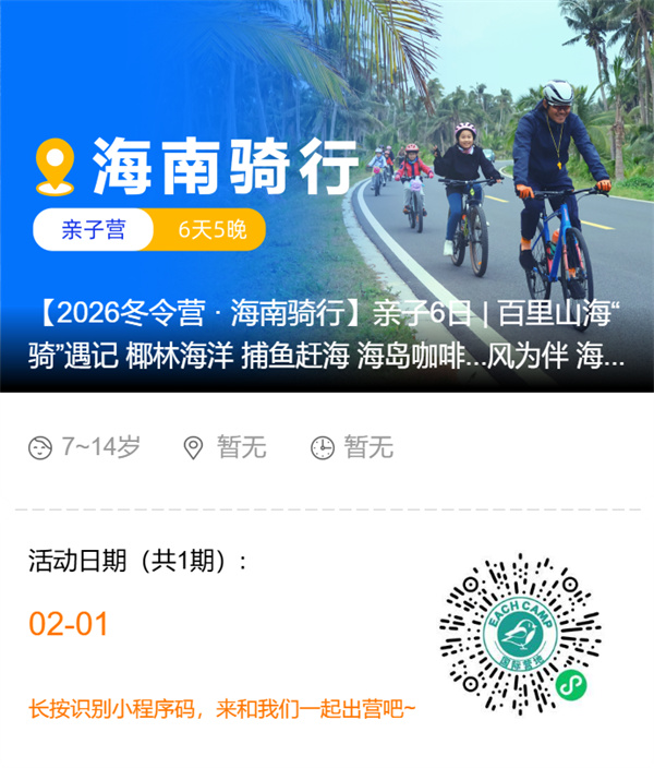我们活动地点位于海口至三亚路段,1-2月份白天在20-25℃,晚上15℃左右,北方过来的宝贝温差会比较大,大家注意出发前多带些衣服;骑行装备、泳衣泳镜、防晒衣、太阳镜必备。
