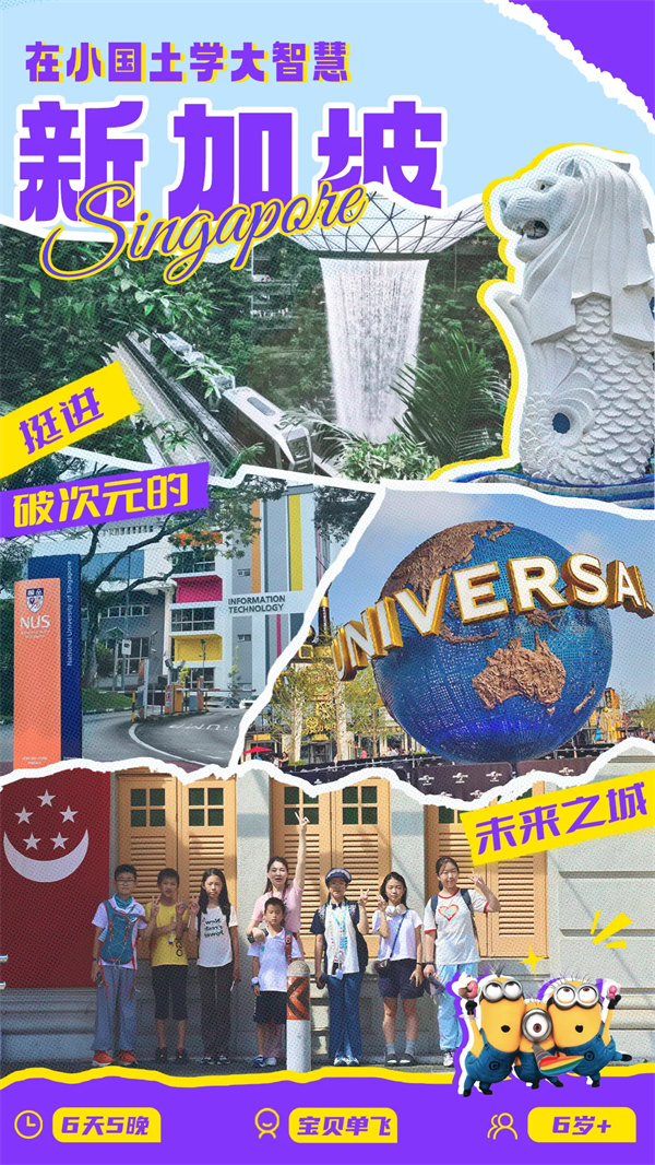 我们将全程入住新加坡星级酒店,2人一间(如有男女单房差,可能会出现个别3人间/家庭房),设施完善,独立卫浴,全程连住,无需中途更换酒店,让孩子体验更舒适的住宿环境。