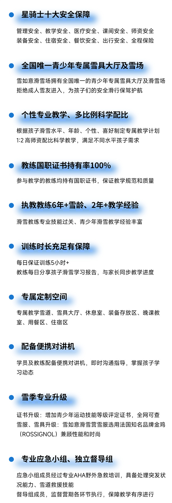 同时,滑雪教练平均6年+雪龄、2年+青少年滑雪教学经验。全面保证竞技营孩子们的滑雪需求。