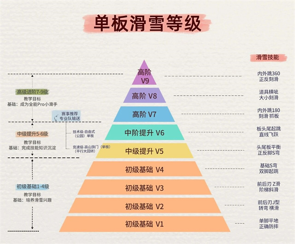 单板1-4级和双板1-5级为初级基础教学阶段,本阶段为滑雪学习基础阶段,以培养兴趣、良好滑雪习惯和标准滑雪动作为主。