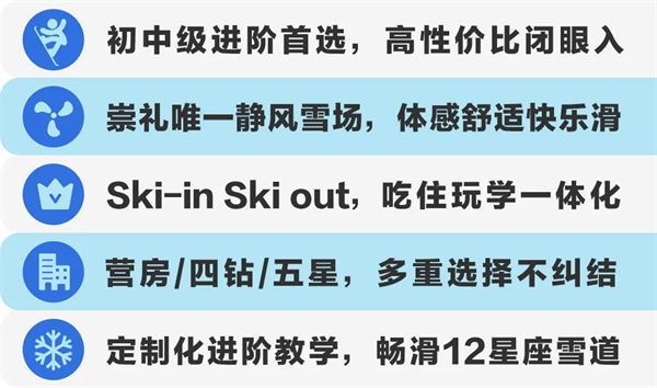如果家里有初中级水平的娃,那一定要看看冰雪进阶营:崇礼唯一静风雪场、定制化学习计划、十二星座雪道...更有营房/四钻/五星多种酒店选择。