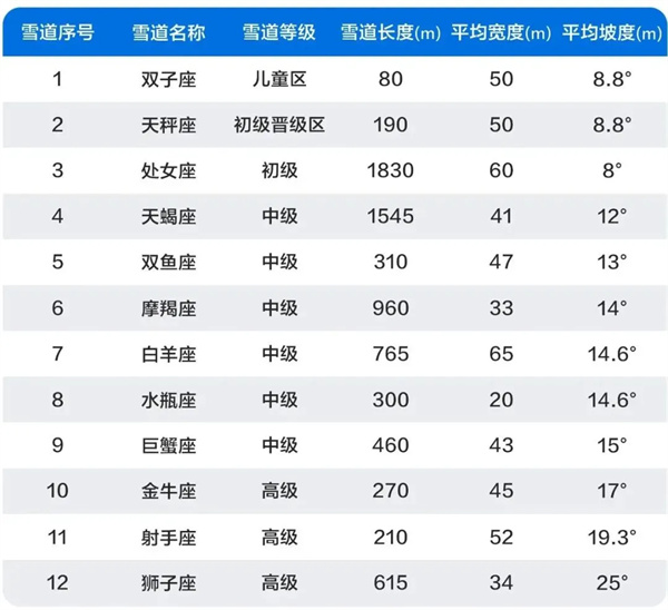 雪道面积30万平方米,场地内根据雪道走势和特点,与星座相结合,设置了12星座特色雪道。