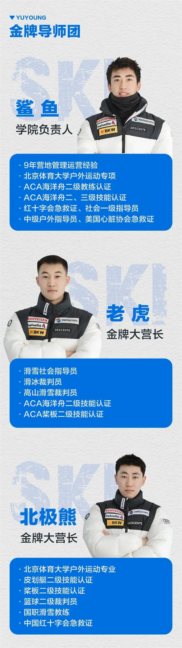 从北京体育大学等全国顶尖学府专门选拔、培训专业滑雪教练,搭建了一支单双板全能的教练梯队,均接受学院统一青少年教学培训,滑雪教练国职持证率100%。