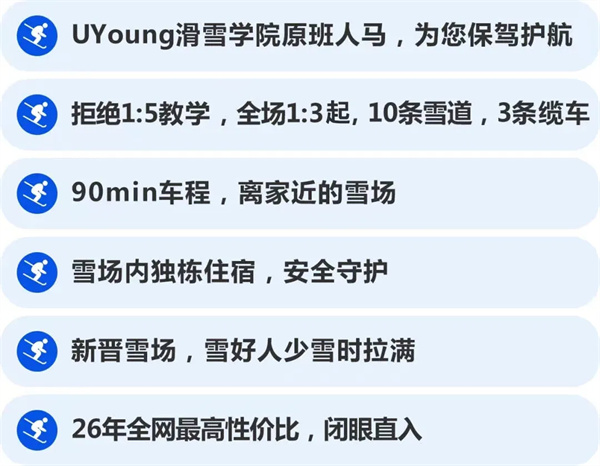 在滑雪上面,妈妈们的要求其实很简单,安全、专业、雪场好、食宿好、性价比、老师负责、能随时掌握孩子的动向,这些条件在YUYOUNG滑雪学院通通满足!