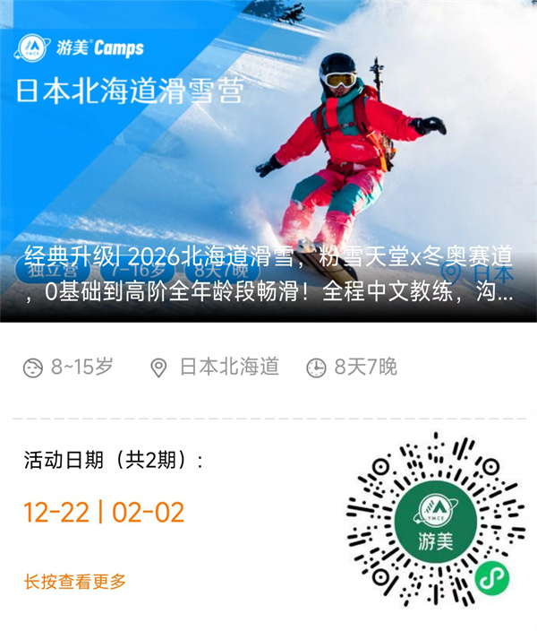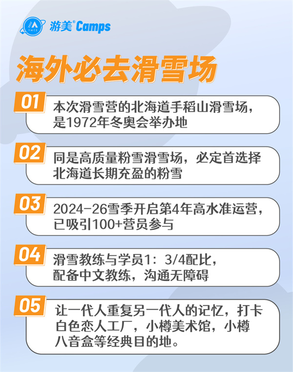 游美·日本北海道滑雪营将在札幌市手稻山滑雪场——1972首次在亚洲举办的冬奥会的地方开启8天7晚的滑雪度假体验,专业、科学的教学规划,满满4天纯滑雪,给予孩子们充分享受滑雪时间。雪场拥有15条线路,6KM超长初学者滑道供初学者畅滑,1:3-4教练比,全程配备中文教练。