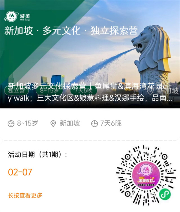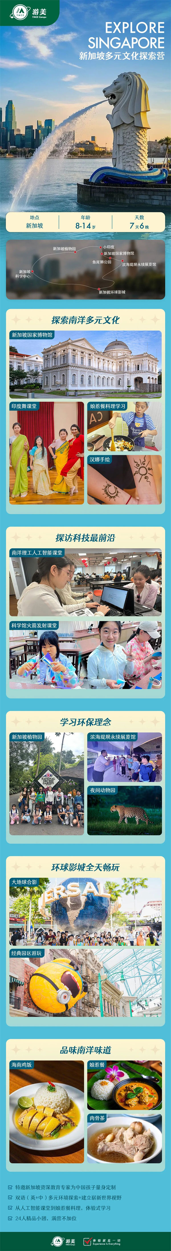 在游美新加坡·多元文化探索营一起"探秘花园城,科技艺术交融,文化视野拓,动物为伴,乐园寻童真,成长之旅启!"身临其境开启这场童年专属全新探索成长之旅!特邀新加坡资深教育专家加入设计本次活动,融合了IB教育理念中对“未来世界公民”(International Mindedness)的定义,以及17个联合国可持续发展目标中与此次新加坡之旅相契合的点(第4点和第11点),为中国孩子“独立成长,探索世界”100%精心定制。
