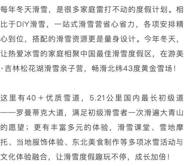 吉林松花湖滑雪场——亚洲最大规模雪场,距离吉林市区仅15公里!这里山高林密,空气清新,雪期长,雪质丰厚,硬度适中,还能零距离欣赏中国四大气象奇观之一的吉林雾凇,拥有着无与伦比的滑雪度假资源及气候条件。