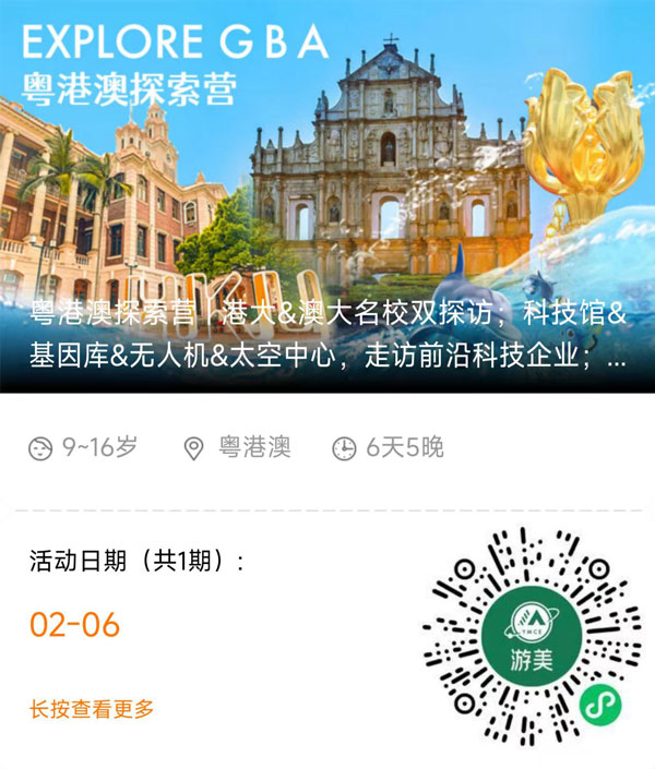 纽约湾区、旧金山湾区、东京湾区,再加上中国的粤港澳大湾区,并称全球四大湾区。是这颗星球上经济最发达、科技创新能力最强的杰出代表。粤港澳大湾区四大核心城市——香港、澳门、珠海、深圳,以港澳双名校顶尖教育资源为纽带,构建国际化学习场景。孩子无需远渡重洋,即可沉浸式体验跨文化思辨、多元学术探索,解锁全球视野,点燃未来名校求学的无限可能。跟随游美粤港澳探索营开启深度探索,既是青少年认知世界的加速器,更是打开全球机遇之门的密钥——无需跨越时区与语言壁垒,即可在本土化场景中完成未来竞争力的系统锻造。